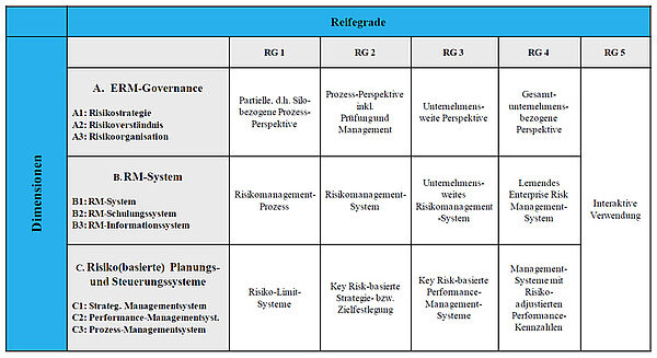 Hierfür wurde anhand der projektinternen Studie das nachstehende ERMMA-Klassifikationsschema entwickelt. In einem ersten Schritt füllen die teilnehmenden Unternehmen einen aus der Studie hervorgegangenen ERMMA-Online-Fragebogen aus. Anschließend wird das ERMMA-Profil des Unternehmens anhand des 5-stufigen ERMMA-Klassifikations-Schemas in den drei Dimensionen, u.z. ERM-Governance, Risikomanagement-System und Risiko-(basierte) Planungs- und Steuerungssysteme gemessen und der sich durch gleichgewichtete Aggregationen berechnete ERMMA-Score ermittelt, durch welchen die Unternehmen miteinander verglichen werden können.
